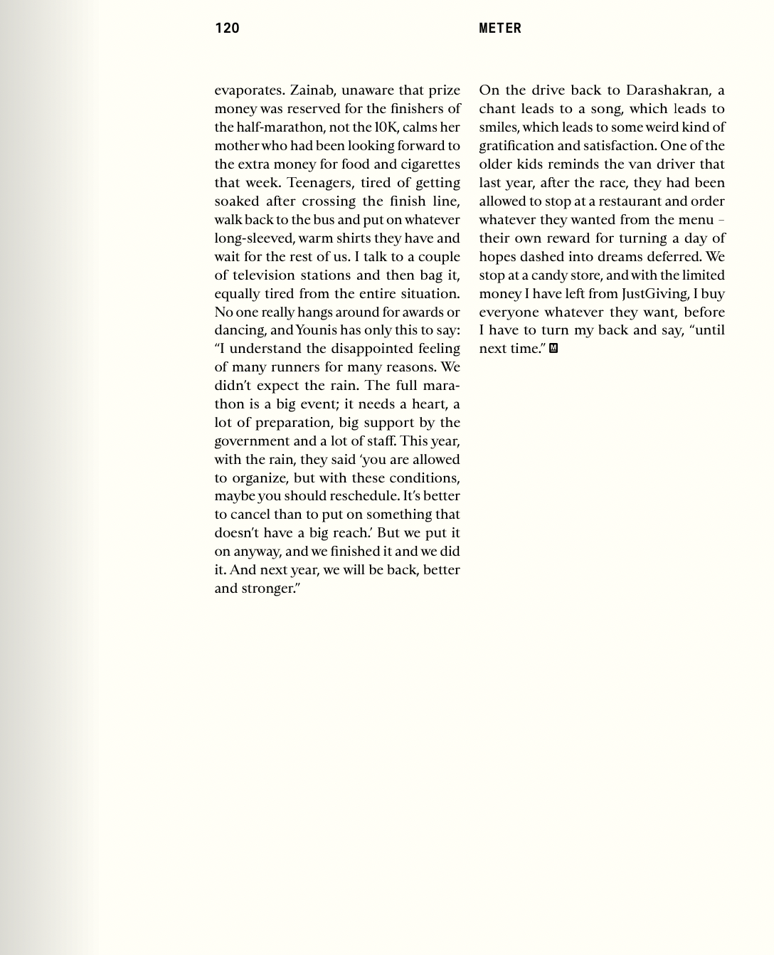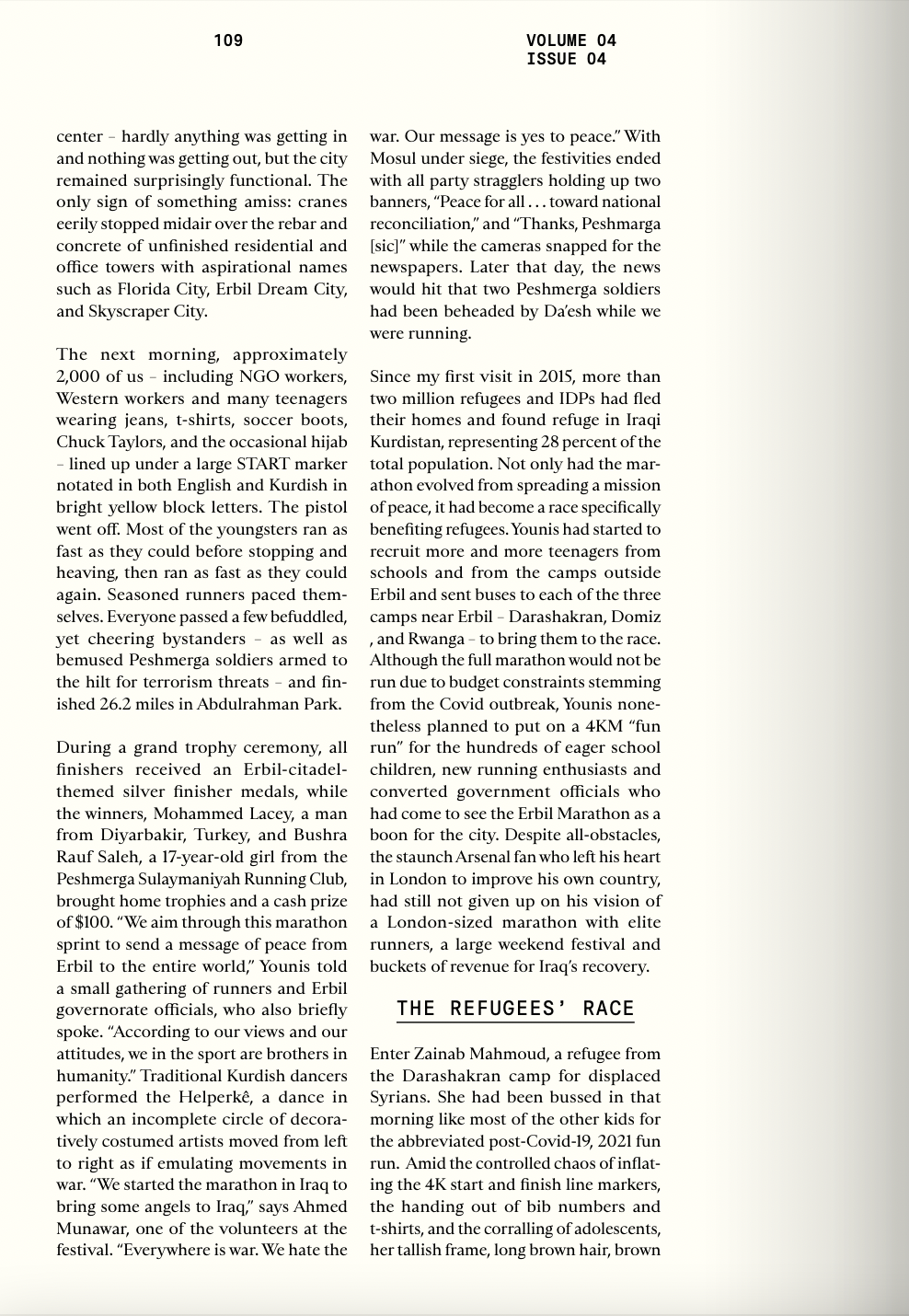 But Ayed and Alatar are not deterred, not even in the face of the USA’s newest as- sault on Iran. The region is again unstable and planned races face cancellation, includ- ing an August road race in Sulymaniyah and the Erbil competition. The Tour de France Femmes remains an even more far-away possibility. Yet, as every good freewheeler knows, slow and steady wins the race – with a touch of oomph toward the end. “I like cycling; I like my life in it,” Ayad says. “Now we have gone from nothing to something. We make races; we clear roads; we have a team. We are crossing barrier by barrier to now make our dreams a reality.”