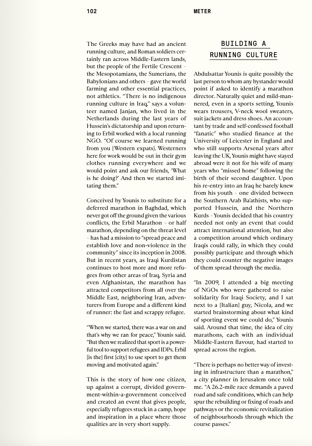 Cycling still has a long way to go, how- ever, especially in Baghdad, especially for women. City engineers, cyclists and envi- ronmentalists have complained about the complete lack of cycle lanes in the country. In order to train, clubs have to bus their teams far outside cities where threats of un- hinged drivers or hiding insurgents loom constantly. The government has a former football stadium – whose architect was Le Corbusier, no less – that could possibly lend itself perfectly to a track. Moreover, Iraq – ranked last on the Global Environmental Performance Index for its car pollution – is just not healthy for cycling lungs.