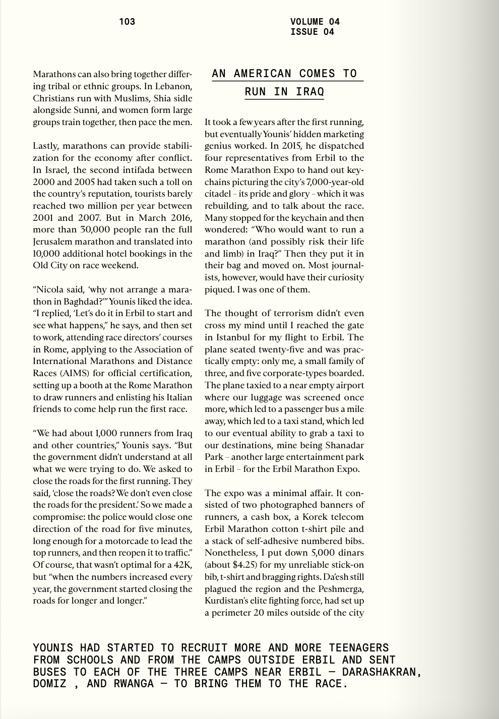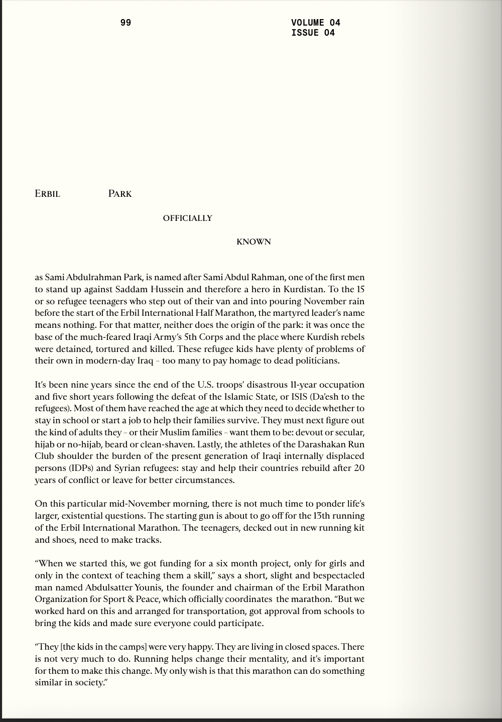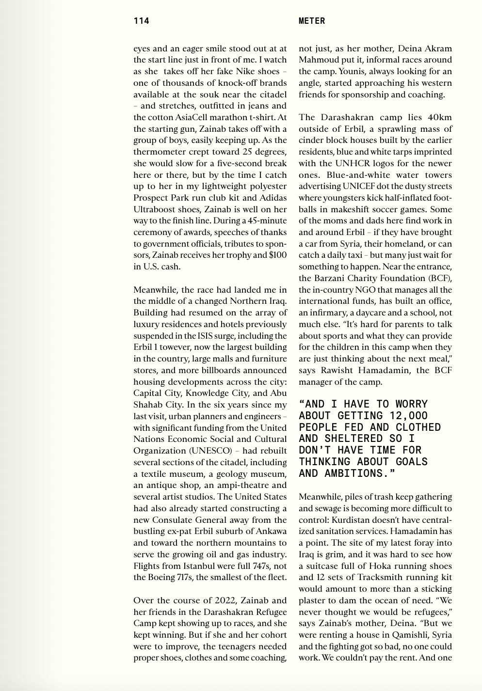 While the USA went from hunting down Saddam, encouraging regime change and enforcing American democracy on a reluctant and quickly fractionalising populace, the women’s Al-Shaab Team formed by Ayad and Alatar found its first coach, Mahmoud Ahmed Fulayih. He saw bigger things on the horizon: men and women’s national teams, junior development and even the Olympics. “I was out at Al-Shaab club, and coach said, ‘You want to race?’ and I said, ‘Sure.’ I fin- ished first,” Ayad said. “I was hooked. And so was Shura.”