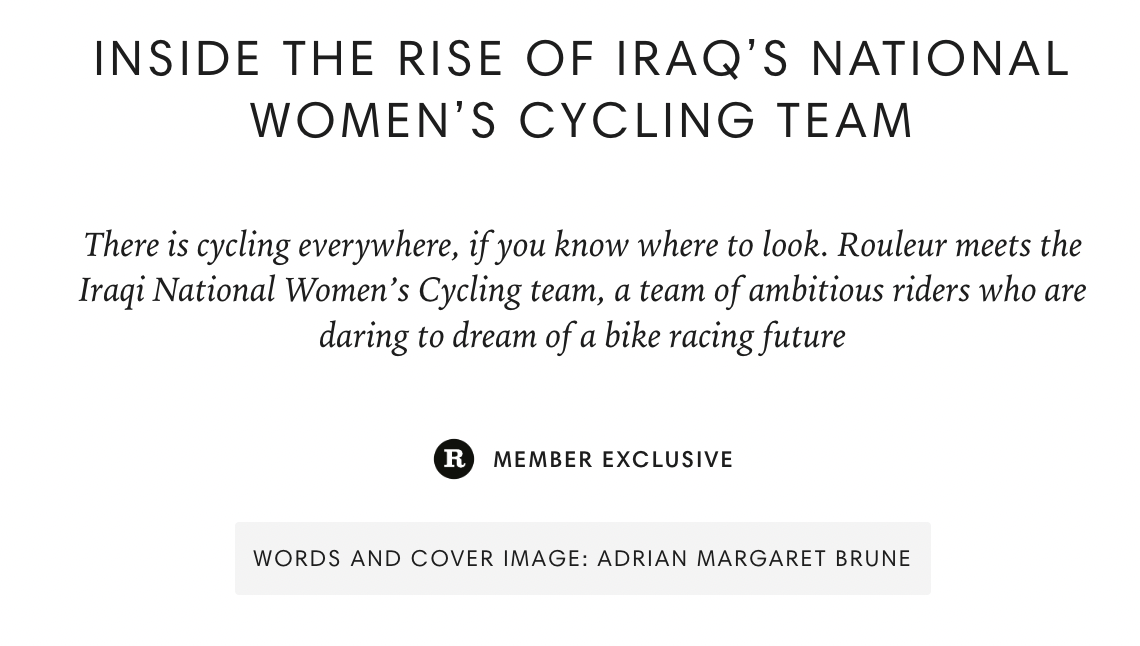 On a chilly February morning – the after-effects of a surprising and significant rain shower – in Bismayah City, a small Baghdad suburb with low-slung Soviet-style block housing, a team of four girls proudly decked out in Iraqi team jerseys over long-sleeve shirts and leggings, ride hard on Turkish-made bicycles. Back and forth, around in circles, they pump hard and coast, repeating their loops as their coach Samed barks commands in Arabic from 20 or so metres away. Occasionally, a car or a taxi passes. Otherwise, the young girls – Lanyah, Sarmad, Rania and Malek – rode relatively unhindered, possibly for the first time all week.